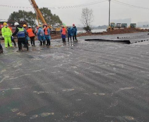 復合土工膜:一邊或者兩邊的布(滌綸布,聚酯切片土工布,有紡編織布,有紡機織布等),中間的膜材為料高密度聚乙烯為原材料通過壓延或者吹塑設備把一邊或者兩邊的布覆合在一起,復合土工膜的縱向和橫向必須預留出10公分--20公分的甩邊的地方用于焊接。
